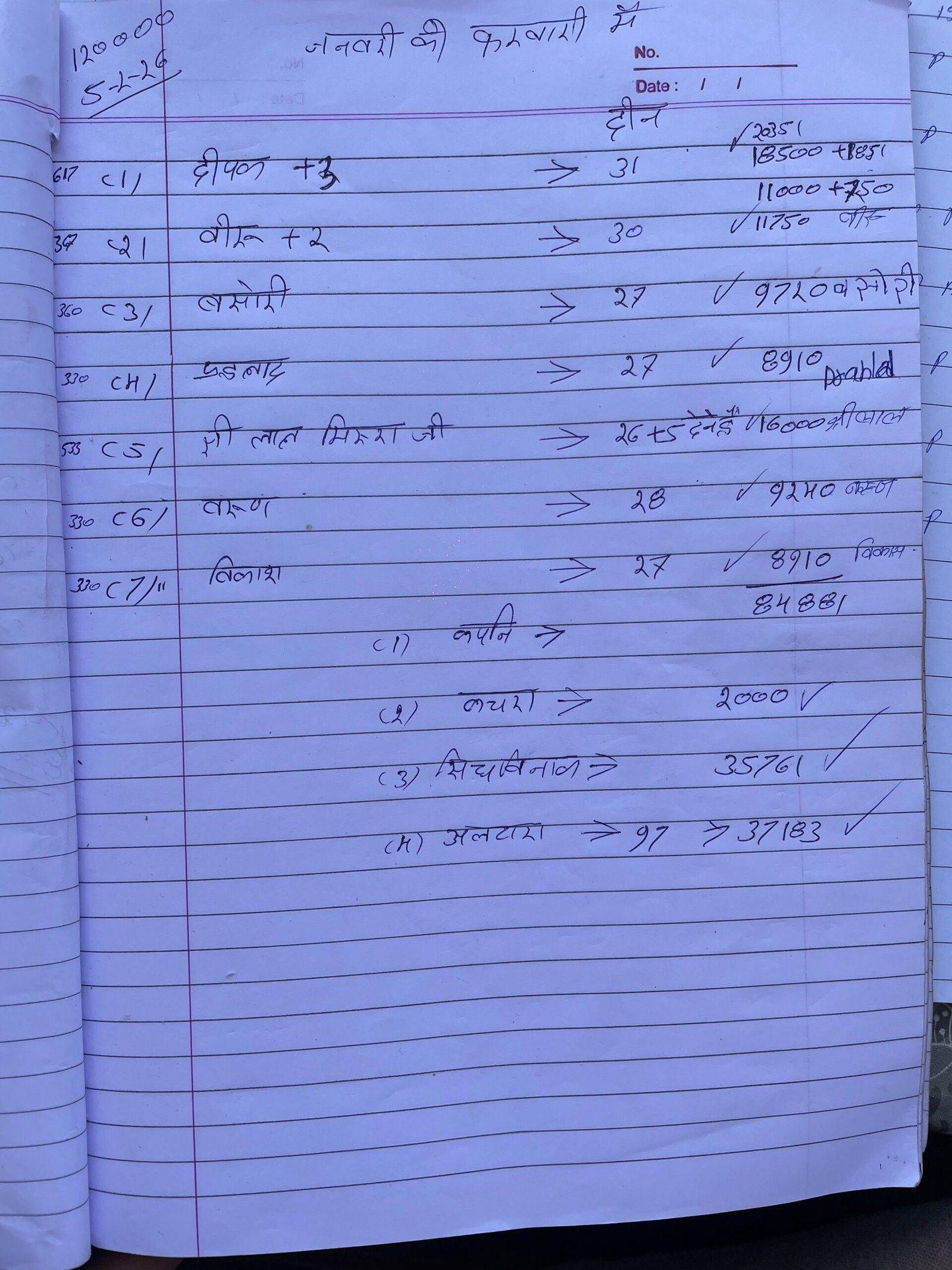 | 2026-01-05 | Vikas (Sweeper) | ₹ 8,910.00 | ₹ -2,176.00 | ₹ 2,775.71 | ₹ -258,483.00 | |||||